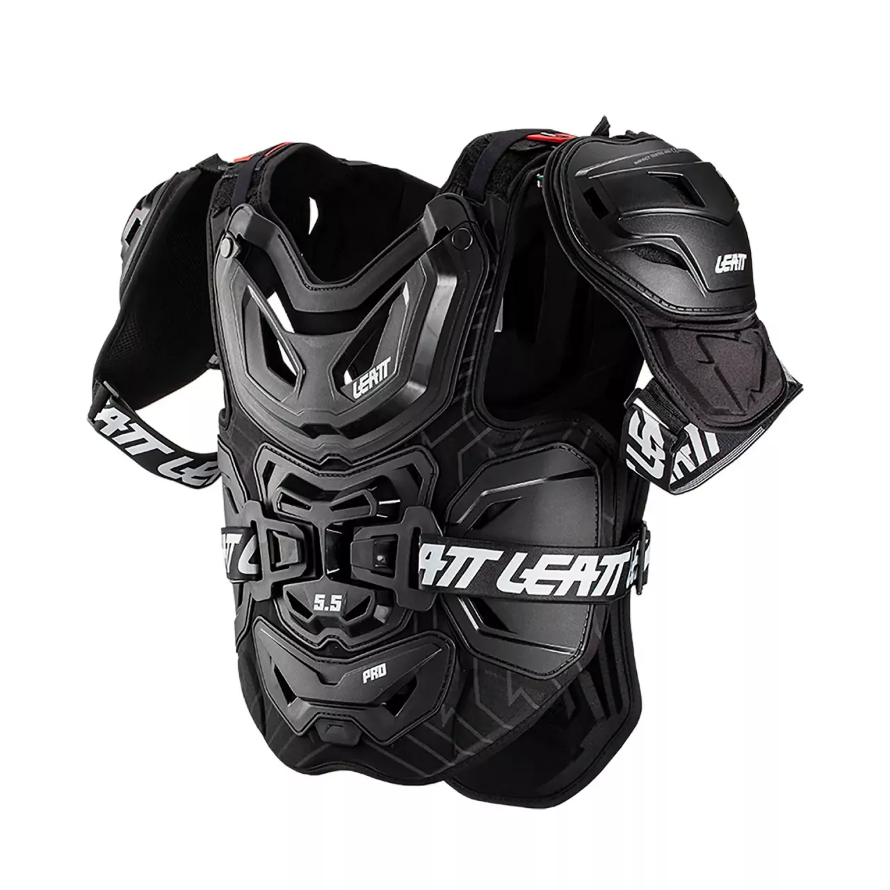 Chránič hrude LEATT CHEST PROTECTOR 5.5 PRO používa tvrdú škrupinu s nárazovou penou 3DF AirFit na spodnej strane, ktorá je certifikovaná CE pre hrudník, chrbát a ramená. 3D viacvrstvový, viacdoskový kĺbový dizajn zaisťuje pohodlie a skvelé prúdenie vzduchu vďaka 53 ventilačným otvorom, funguje s ortézou na krk Leatt alebo bez nej.