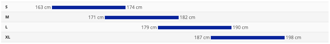 - Veľkosti: S (163 - 174 cm), M (171 - 182 cm), L (179 - 190 cm), XL (187 - 198 cm)