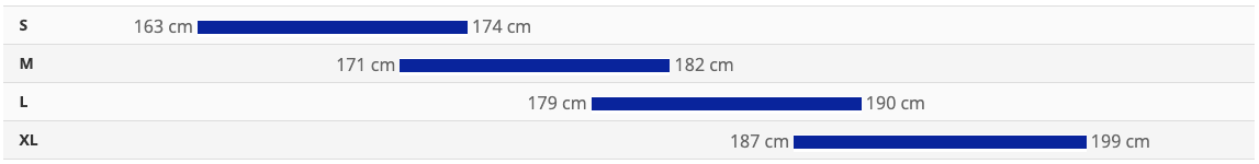 - Veľkosti: S (163 - 174 cm), M (171 - 182 cm), L (179 - 190 cm), XL (187 - 199 cm)