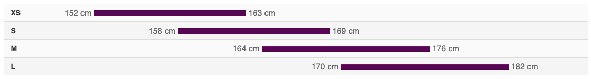 - Veľkosti: XS (152 - 163 cm), S (158 - 169 cm), M (164 - 176 cm), L (170 - 182 cm)
