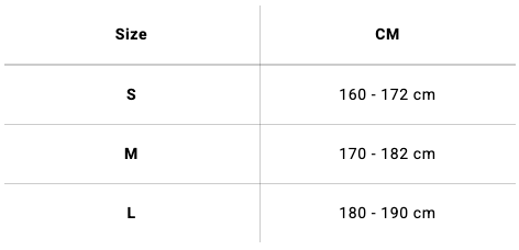 • Veľkosti: S (160- 172 cm), M (170- 182 cm), L (180- 190 cm)