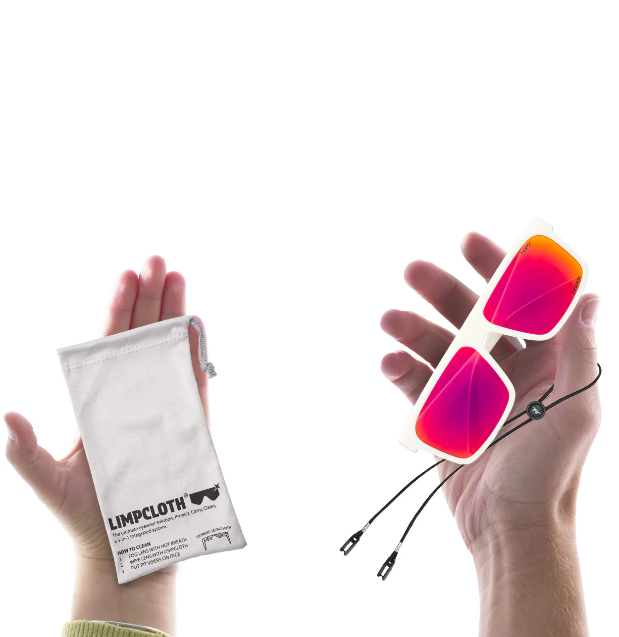 • Okuliare Pit Viper čistite handričkou Limpcloth™ (súčasťou každého páru okuliarov Pit Viper) a horúcim dychom z úst alebo čistiacim prostriedkom na okuliare.