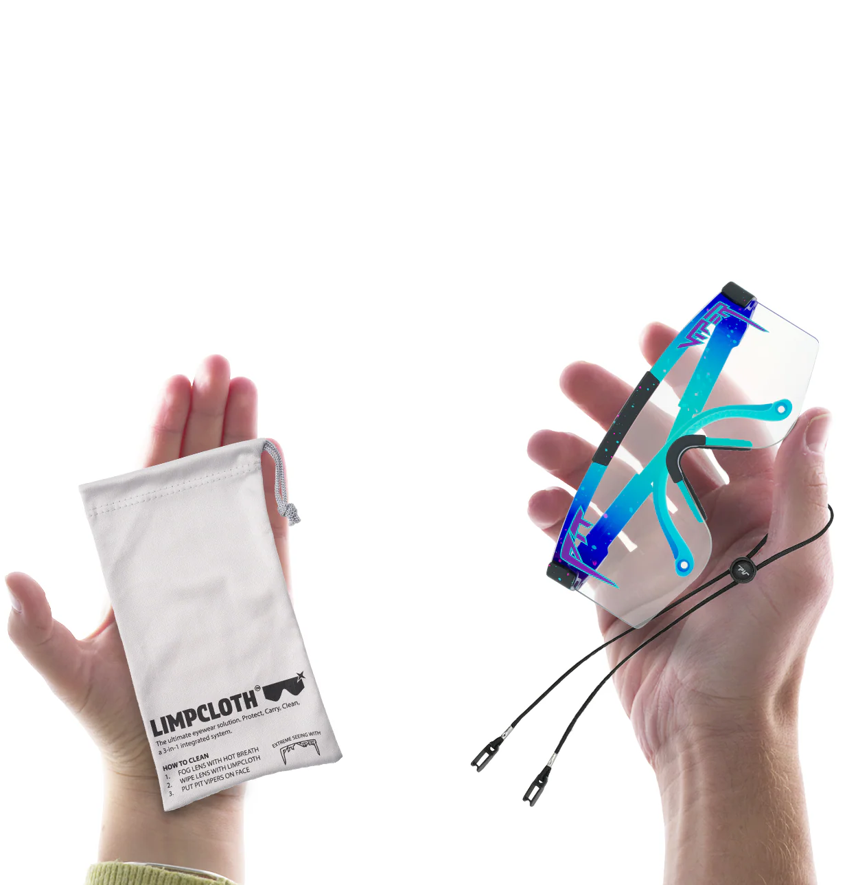- Okuliare Pit Viper čistite handričkou Limpcloth™ (súčasťou každého páru okuliarov Pit Viper) a horúcim dychom z úst alebo čistiacim prostriedkom na okuliare.