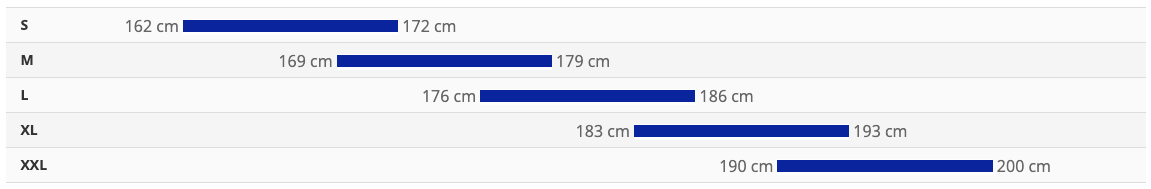 - Veľkosti: S (162 - 172 cm), M (169 - 179 cm), L (176 - 186 cm), XL (183 - 193 cm), XXL (190 - 200 cm)