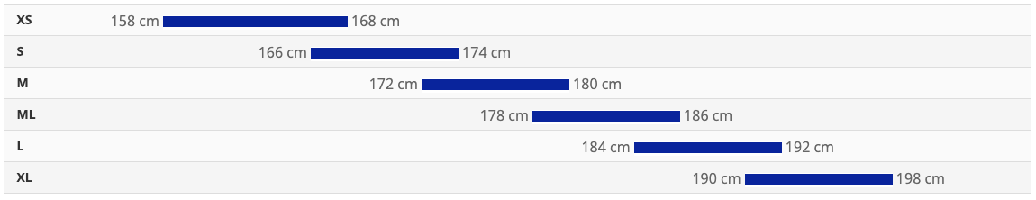 - Veľkosti: XS (158 - 168 cm), S (166 - 174 cm), M (172 - 180 cm), M/L (178 - 186 cm), L (184 - 192 cm), XL (190 - 198 cm)