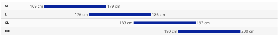 - Veľkosti: M (169 - 179 cm), L (176 - 186 cm), XL (183 - 193 cm), XXL (190 - 200 cm)